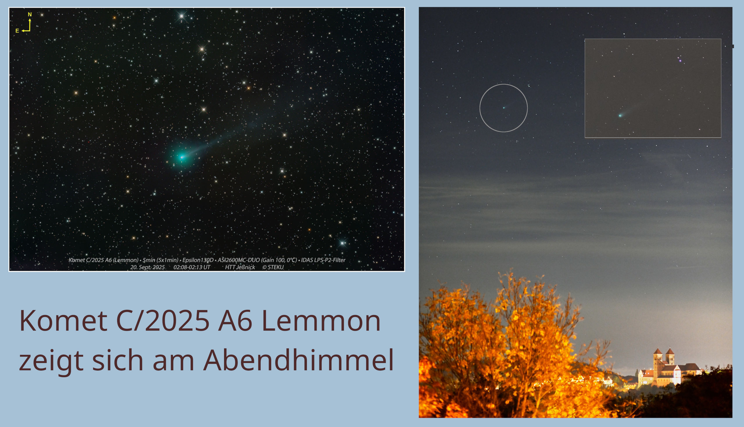 251013…Gestern, am Montag dem 13. Oktober 2025, öffnete sich das Sichtfenster für den Kometen Lemmon. Momentan benötigt man einen Feldstecher und gute „Ortskenntnisse“ um ihn zu entdecken. Bis 26. Oktober stört der Mond nicht und der Komet wird bis dahin heller, so daß er mit etwas Glück am abendlichen Westhimmel in ca. 20° Höhe ohne weitere Hilfsmittel zu beobachten ist.